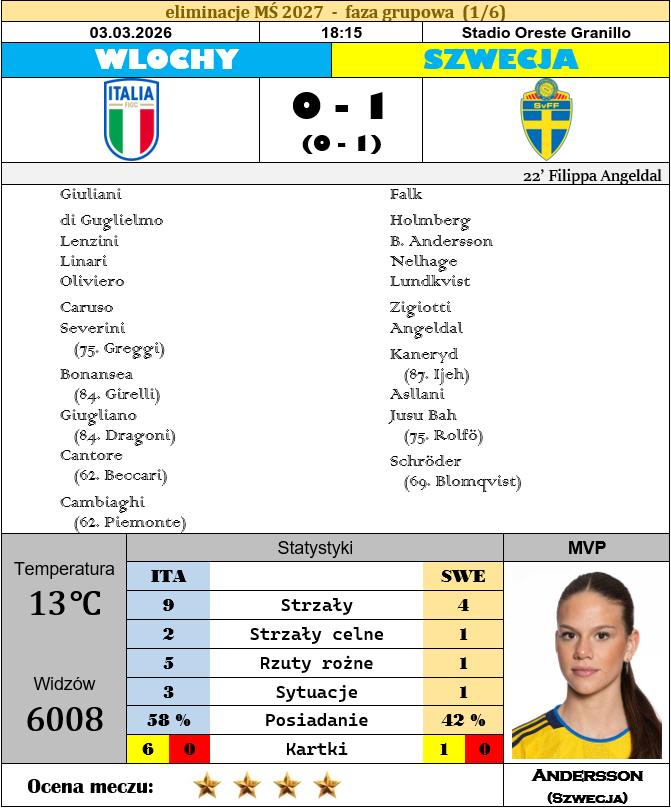 Po jednym z poprzednich włosko-szwedzkich starć pokusiłem się o śmiałą tezę, że oto odbył się mecz, w którym jedna strona zrobiła wiele, aby go przegrać, a druga równie dużo, aby go nie wygrać. Tym razem nastrój towarzyszący boiskowym wydarzeniom był zgoła odmienny: oba zespoły dążyły do sięgnięcia po trzy oczka wszelkimi dostępnymi sposobami, a gospodynie z Italii nie uciekały się również od regularnego przekraczania przepisów gry w piłkę nożną. Swój cel osiągnęła jednak tylko jedna z zainteresowanych drużyn i dokonała tego, oddając dzisiejszego wieczora zaledwie jeden celny strzał. Na Stadio Oreste Granillo triumf święciła jednak nie statystyka, nie współczynniki goli oczekiwanych, a zespołowość, poświęcenie i głęboka wola zwycięstwa. W sporcie często nadużywa się stwierdzenia, że oto wygrywa ten, któremu bardziej na tym zależy, lecz dziś jest ta wyjątkowa sytuacja, w której słowa te zdają się w stu procentach oddawać stan faktyczny. Młoda Szwecjo, jesteś piękna!