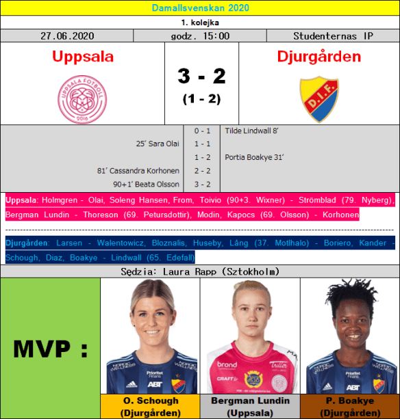 Historyczny dzień przeżyli za to sympatycy futbolu z Uppsali, gdyż debiutująca w krajowej elicie drużyna Jonasa Valfridssona już w pierwszym meczu odniosła tyle sensacyjne, co w pełni zasłużone zwycięstwo. Złożyły się na nie dwa perfekcyjnie wykonane stałe fragmenty oraz trafienie Beaty Olsson, które już w doliczonym czasie gry pogrążyło wciąż niepotrafiące odnaleźć swojego stylu Djurgården. Bardzo ambitnie pokazał się także drugi z tegorocznych beniaminków, ale dzięki super-rezerwowej Fernandzie Da Silvie to Piteå okazało się lepsze o jednego gola w Derbach Północy. Już tradycyjnie, wielką niewiadomą była postawa mocno przemeblowanego zimą zespołu z Linköping, który póki co w starciu z Växjö wykazał się przede wszystkim dużą efektywnością. Tercet Landström – Maanum – Orji potrzebował niespełna dwudziestu minut, aby trzema golami odebrać rywalkom ze Småland nadzieję na korzystny wynik, ale prawdziwą wartość tegorocznego projektu LFC poznamy dopiero w najbliższych tygodniach. Niezwykle ciekawe z perspektywy neutralnego kibice spotkanie odbyło się na Behrn Arenie, gdzie po festiwali goli samobójczych i kuriozalnych, punktami podzieliły się ostatecznie Örebro i Eskilstuna.