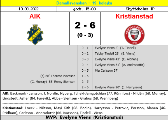 Umeå, Kalmar, AIK i Bromma niezmiennie prezentują poziom co najwyżej drugoligowy i nawet trochę nieoczekiwany rezultat z LF Areny niewiele w tej kwestii zmienia. Paradoksalnie, ewentualna karna degradacja Eskilstuny (której zapewne się nie doczekamy, a szkoda) może sprawić, że w kolejnym sezonie znów będziemy mogli podziwiać nawet trzy spośród wymienionych tu klubów w najwyższej klasie rozgrywkowej. Z kronikarskiego obowiązku dodajmy jeszcze, że w poniedziałkowy wieczór odbył się mecz dwóch zespołów, które już na tym etapie sezonu grają absolutnie o nic. I nie będzie chyba żadnego zaskoczenia w tym, że wyglądał on dokładnie tak, jak starcie dwóch zespołów grających absolutnie o nic. A ponieważ mniej błędów popełniły w nim zawodniczki ze Skanii, to one wyjechały ze Stadionu Olimpijskiego z kompletem punktów. Djurgården natomiast wciąż pozostaje bez choćby jednego zwycięstwa w rundzie jesiennej, ale mając na uwadze sytuację w tabeli, Dumie Sztokholmu nie grozi z tego tytułu zupełnie nic.