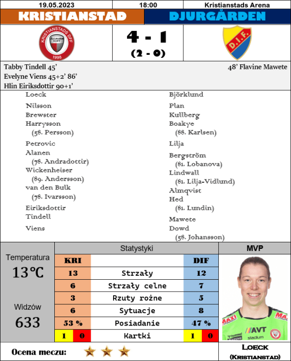 A co tam słychać u beniaminków? Växjö z Uppsalą strzeliły sobie wzajemnie po trzy prawidłowe gole, ale w meczowym protokole… zremisowały 2-2 i nic dziwnego, że obie strony odczuwały z tego tytułu całkiem spory niedosyt. Powody do zadowolenia także się jednak znalazły; po stronie gospodyń dostarczyły ich przede wszystkim Dessi Dupuy, Alexandra Jonasson oraz Evelyn Ijeh, zaś wśród rywalek Klara Folkesson i Matilda Kristell. Ta ostatnia miała szczególną okazję do świętowania, gdyż trafienie z 78. minuty było jednocześnie jej pierwszym na poziomie Damallsvenskan. I możemy przypuszczać, że pozostanie ono na długo w jej pamięci, gdyż jak przyznała z rozbrajającą szczerością sama zainteresowana, celny strzał był tak naprawdę nieudaną próbą dośrodkowania. Cóż, w futbolu czasami po prostu trzeba mieć trochę szczęścia. Na jego brak narzekać mogą za to w Norrköping, bo choć przyjezdne z Brommy tylko raz poważnie zagroziły bramce Sofii Hjern, to komplet punktów i tak pojechał z nimi do zachodniego Sztokholmu. Hitem poniedziałkowego grania miała być rywalizacja Kristianstad z Hammarby. Oba zespoły przystępowały do bezpośredniego starcia z identycznym dorobkiem i ten stan rzeczy ani trochę nie zdezaktualizował się po rozegraniu dziesiątej serii spotkań. W pewnym momencie mogło się wydawać, że to podopieczne trenera Pinonesa-Arce sięgną w tej potyczce po komplet punktów, ale gdy w 83. minucie udało im się wreszcie skutecznie przełamać defensywę rywalek, to piłkarki ze stolicy najwyraźniej uznały, że robota na dziś została wykonana i teraz wystarczy już tylko poczłapać sobie po murawie w wyczekiwaniu na końcowy gwizdek. Taktyka ta okazała się jednak mocno chybiona, a wyraźnie podrażnione gospodynie nie tylko wyrównały stan rywalizacji, ale miały jeszcze dwie wyborne piłki meczowe, aby to im udało się ostatecznie sięgnąć po pełną pulę. I gdyby nie ekwilibrystyczne interwencje odpowiednio Evy Nyström i Anny Tamminen na linii bramkowej, to tak zapewne by się stało. Przybyłym do północno-wschodniej Skanii fanom Bajen nastroje regularnie poprawiały jednak informacje napływające ze Stadionu Olimpijskiego w Sztokholmie, gdzie w równolegle rozgrywanym meczu Djurgården tracił kolejne gole w starciu z Vittsjö. Co ciekawe, w barwach ekipy z okolic Hässleholm po raz pierwszy w tym roku na listę strzelczyń wpisały się solidarnie Markstedt i Sällström, a to bez względu na okoliczności zawsze zwiastuje kłopoty rywalkom drużyny Ulfa Kristianssona.