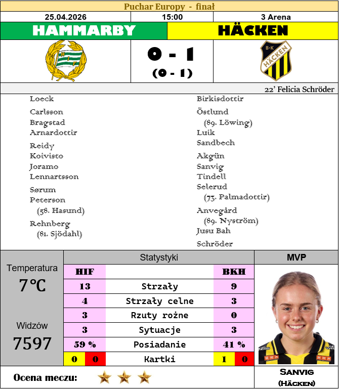 Czekaliśmy, czekaliśmy i doczekaliśmy się! Jasne, format dwumeczu trochę nam skalę tego wydarzenia rozmywa, lecz jasne jest, że dziś bynajmniej nie zebraliśmy się w tym miejscu po to, aby narzekać. Hammarby i Häcken między sobą rozstrzygają kwestię zwycięstwa w inauguracyjnej edycji piłkarskiego Pucharu Europy, a my jesteśmy naocznymi świadkami tej epokowej nie tylko dla szwedzkiego futbolu klubowego chwili. A żeby zrobiło się jeszcze bardziej ekscytująco, to warto przypomnieć, że na stole leży nie tylko niewymazywalne miejsce w annałach naszej dyscypliny sportu, ale i niemal gwarantowane miejsce w fazie zasadniczej Ligi Mistrzyń 2026-27, bez konieczności przebijania się przez bardzo skomplikowane kwalifikacje. Zdecydowanie było zatem o co grać, choć pewnie wielu neutralnych kibiców i obserwatorów nie miałoby nic przeciwko, aby pierwszy akt tej długo wyczekiwanej sztuki nie przyniósł nam jeszcze wszystkich najistotniejszych odpowiedzi.