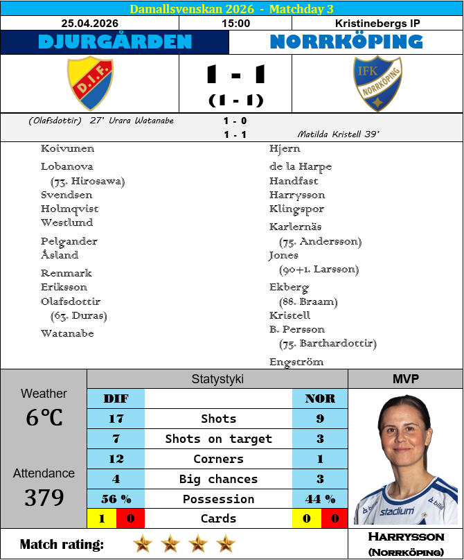 Na pozostałych arenach sobotnie granie przyniosło nam podziały punktów, choć zarówno w Uppsali, jak i w Kristinebergu, fani obu rywalizujących zespołów przeżywali istny, emocjonalny swing. Skazywany na niemal pewną degradacją beniaminek dzielnie stawiał się przeżywającym ewidentny kryzys czternastokrotnym mistrzyniom kraju z Rosengård, a plan przygotowany przez trenera Brekkana działał do tego stopnia perfekcyjnie, że sama tylko Älvali Lindström zmarnowała dwie stuprocentowe okazje do wyprowadzenia gospodyń na prowadzenie. Inna kwestia, że w przypadku drugiej z nich kapitalną interwencją na wślizgu popisała się Molly Johansson, niejako ratując swój zespół przed niechybną katastrofą. Konsekwentnie grające piłkarki z Uppsali celu ostatecznie dopięły za sprawą mierzonego strzału Amandy Sundström zza pola karnego, lecz rosnący napór Rosengård pozwolił gościniom wrócić do gry za sprawą wyrównującego trafienia Remy Siemsen. Na zgarnięcie pełnej puli zawodniczkom ze Skanii zabrakło już jednak konceptu, dzięki czemu ofiarnie broniące się zawodniczki beniaminka wciąż pozostają w tegorocznej kampanii niepokonane na własnym obiekcie. 1-1 to także końcowy wynik rywalizacji Djurgården z Norrköping i w niczym nie zmienia tego fakt, że sama tylko Urara Watanabe w sobotnie popołudnie strzeliła dwa jak najbardziej prawidłowe gole. O taki stan rzeczy Duma Sztokholmu pretensje może mieć jednak wyłącznie do siebie, gdyż pomijając postawę ekipy sędziowskiej, Djurgården w dwóch inauguracyjnych kwadransach wypracował sobie tak kolosalną przewagę, że ten mecz już wówczas powinien być w zasadzie rozstrzygnięty. Taśmowo niewykorzystywane okazje zemściły się już przy okazji pierwszego, ofensywnego wypadu przyjezdnych, kiedy to po akcji Carrie Jones do remisu doprowadziła sytuacyjnym strzałem przy dalszym słupku Matilda Kristell. A druga połowa przyniosła nam już zdecydowanie bardziej wyrównany obraz gry i w tej fazie meczu to Anna Koivunen musiała wykonać najbardziej efektowną interwencję, ratującą swojemu zespołowi przynajmniej jeden punkt.