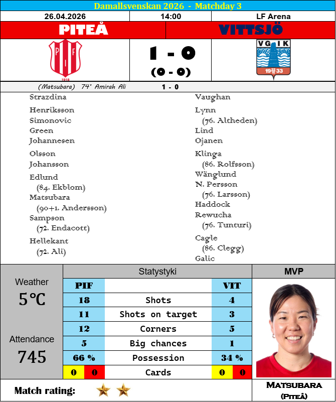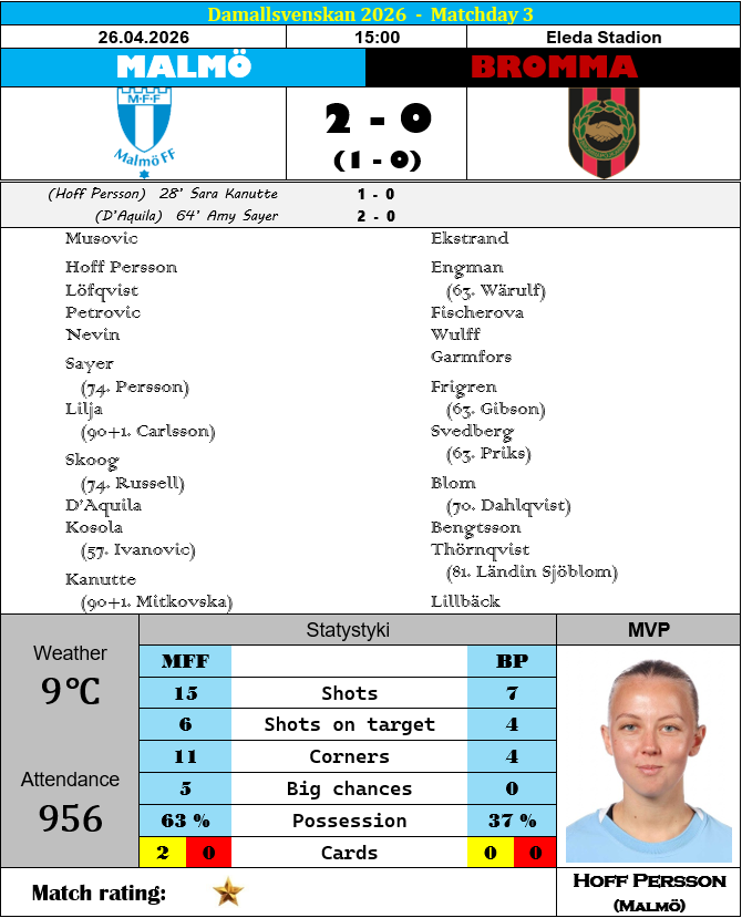 Ligową niedzielę rozpoczęliśmy rywalizacją, która spokojnie mogłaby być personifikacją Damallsvenskan. Wczesne popołudnie, chłodna i wietrzna aura, na murawę wychodzą piłkarki Piteå oraz Vittsjö, gospodynie grają, przyjezdne odgryzają się pojedynczymi, lecz zdecydowanie bardziej konkretnymi wyskokami, a na koniec któraś ze stron wygrywa 1-0. Jedyna niezgodność polegała w zasadzie na tym, iż zwycięskie trafienie nie było efektem absurdalnego kiksu, a mądrej, przemyślanej, zespołowej akcji, w której w pierwszoplanowych rolach wystąpiły Japonka Shiho Matsubara oraz Amerykanka Amirah Ali. Mówiąc jednak całkiem serio, w tym meczu po komplet punktów sięgnęła drużyna lepsza tego dnia w każdym elemencie futbolowego rzemiosła i trener Blagojevic zdecydowanie ma o czym myśleć. Podobnie jak Vittsjö, zerowym dorobkiem punktowym po trzech rozegranych meczach legitymuje się także ekipa z Brommy. Wystarczy jednak pobieżnie zerknąć w ligowy terminarz, aby skonstatować, że dla zawodniczek z zachodniego Sztokholmu właściwy sezon zaczyna się dopiero w najbliższy weekend. Zdecydowanie więcej powodów do niepokoju mają za to w Malmö, bo choć pojedyncze zawodniczki Błękitnych (Hoff Persson, D’Aquila, Nevin, czy Kanutte) złapały u progu wiosny oczekiwany flow, to jednak całościowo drużyna trenera Valfridssona absolutnie w niczym nie przypomina głównego faworyta do mistrzowskiego tytułu. A czasu na dokonywanie niezbędnych korekt z każdym upływającym dniem zostaje coraz mniej.